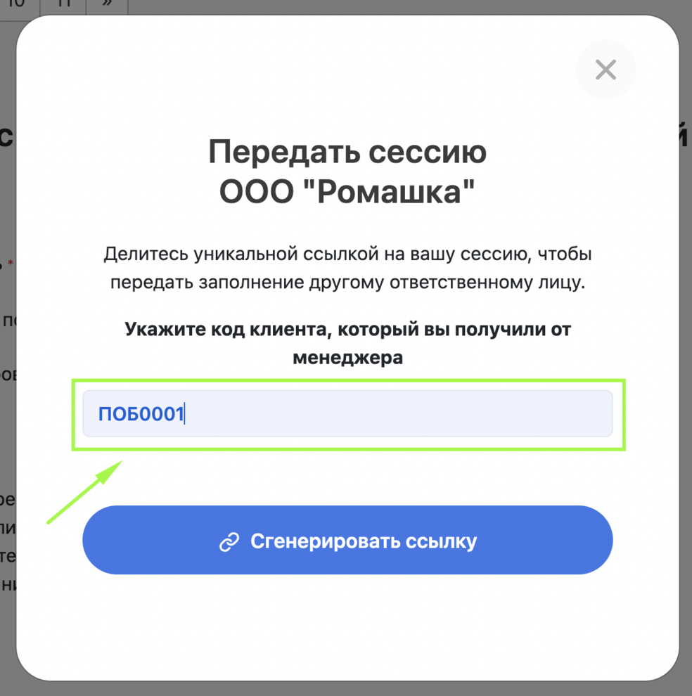 Чтобы передать текущую сессию предусмотрена генерация уникальной ссылки, которую на следующих шагах вы сможете отправить прямо на почту получателю. Для этого введите в поле код клиента, который вы указывали при оплате ранее.